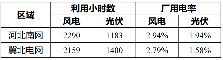 表:河北第一次竞价利用小时与厂用电率(单位:h)