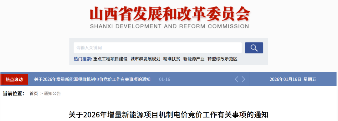 1月16日,山西发改委印发《关于2026年增量新能源项目机制电价竞价工作有关事项的通知》,计划2026年1月1日至2026年12月31日期间投产以及2025年6月1日至12月31日投产未纳入机制电价的新能源项目可以参与竞价,不含跨省跨区通道配套新能源项目、新能源就近消纳项目。